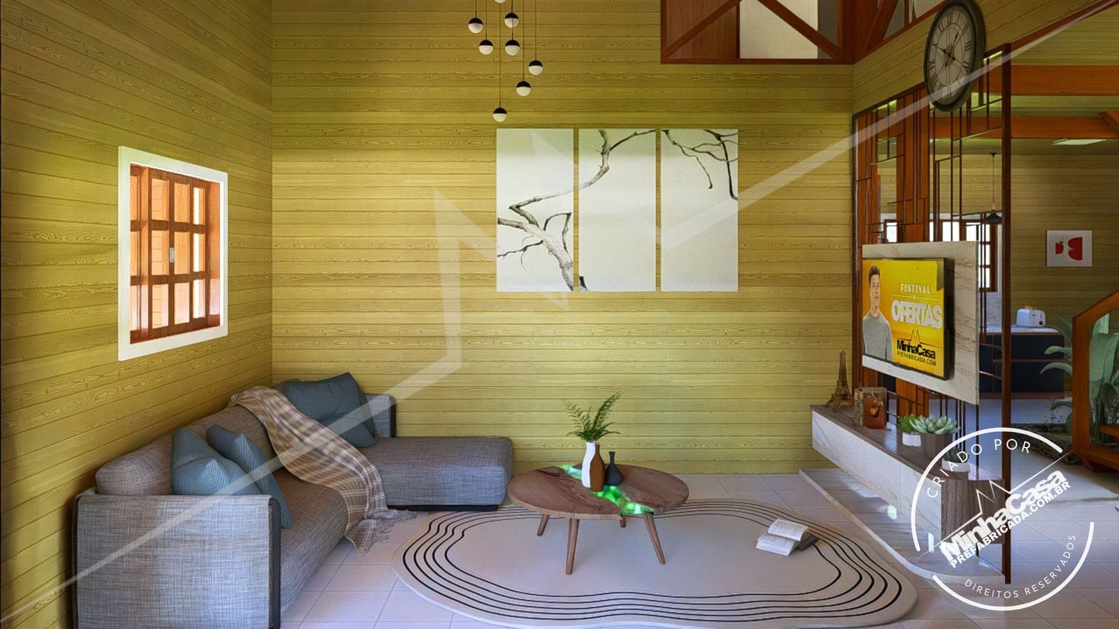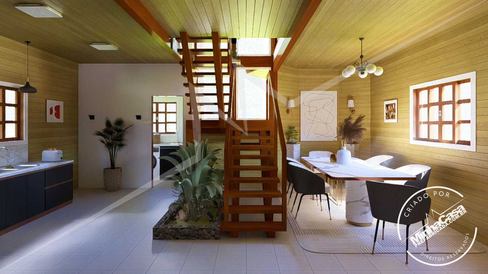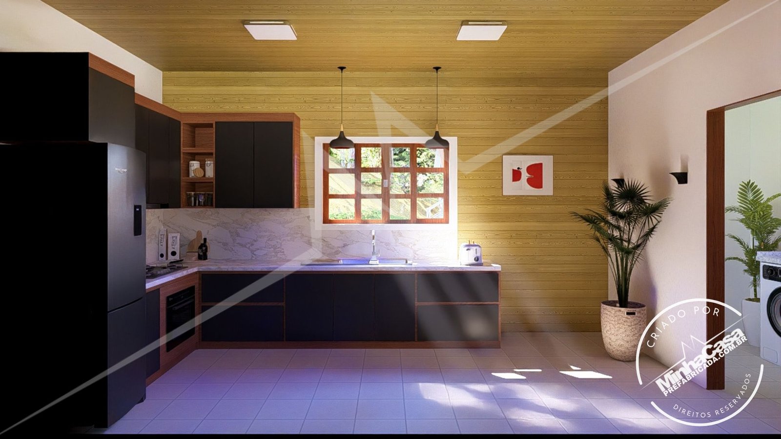 Kit de casa pré-fabricada com três quartos sendo todos suítes, este projeto é no sistema de encaixe, com sala e cozinha individual. 10,67×14,44 Ideal para terreno de 12Mx24M.